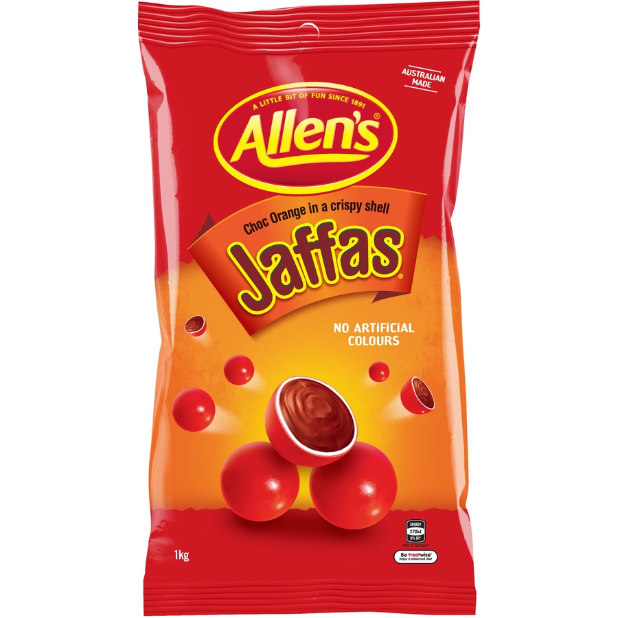 Allen’s Jaffas are choc balls covered in an orange flavoured shell. Each consists of a soft chocolate centre with a hard covering of orange flavoured, orange coloured confectionery. This 1kg pack is ideal for wholesale, sharing with friends and family, or adding to party bags and treat selections. The confectionery is currently made in Australia by Allen’s lollies, a division of Nestlé. A nostalgic piece of Australian confectionery culture that ships from SweetsWorld.