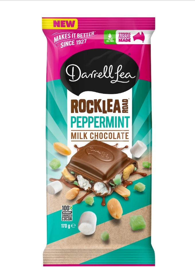 Darrell Lea Milk Choc Peppermint Rocklea Road Block 170g brings the famous Aussie Rocklea Road recipe into a peppermint block format, with soft marshmallow, peanuts and cherry pieces set in creamy milk chocolate and a cool peppermint lift. Made in Australia by Darrell Lea, the 170g slab snaps into chunky squares that suit a family share, a weekend movie night or a chocolate-and-coffee catch up. Pop a square into a lunchbox, arrange pieces on a grazing board or tuck the block into a gift hamper. A fresh twist on a long-running Aussie chocolate favourite. Ships from SweetsWorld in Australia.