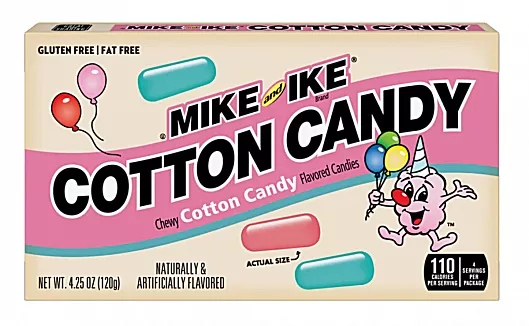 Mike N Ike cotton candy is a soft, chewy American lolly that captures the sweet, fluffy flavour of fairground cotton candy in the familiar Mike N Ike chew format. Each 120g pack is filled with small oval chews that deliver a sugary cotton candy flavour with the firm, fruity chew fans of the brand know well. The pack suits American candy boxes, movie night snack stations, lunchboxes, and novelty lolly selections at kids parties. Pair with other Mike N Ike varieties for a mixed chew assortment. Ships from SweetsWorld in Australia.
