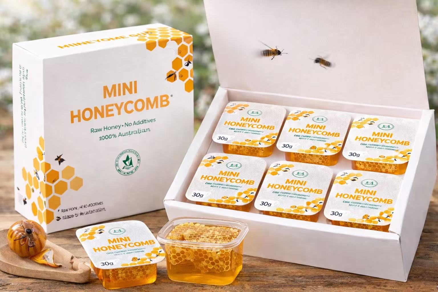 Our Mini Honeycomb contains pure Australian raw honey paired with a natural piece of honeycomb, offering an authentic hive-to-cup experience. Each individual serving delivers the rich aroma, smooth sweetness, and natural texture of premium honey exactly as it occurs in the hive. The honeycomb remains intact within the cup, combining liquid honey with edible beeswax for a unique tasting experience.