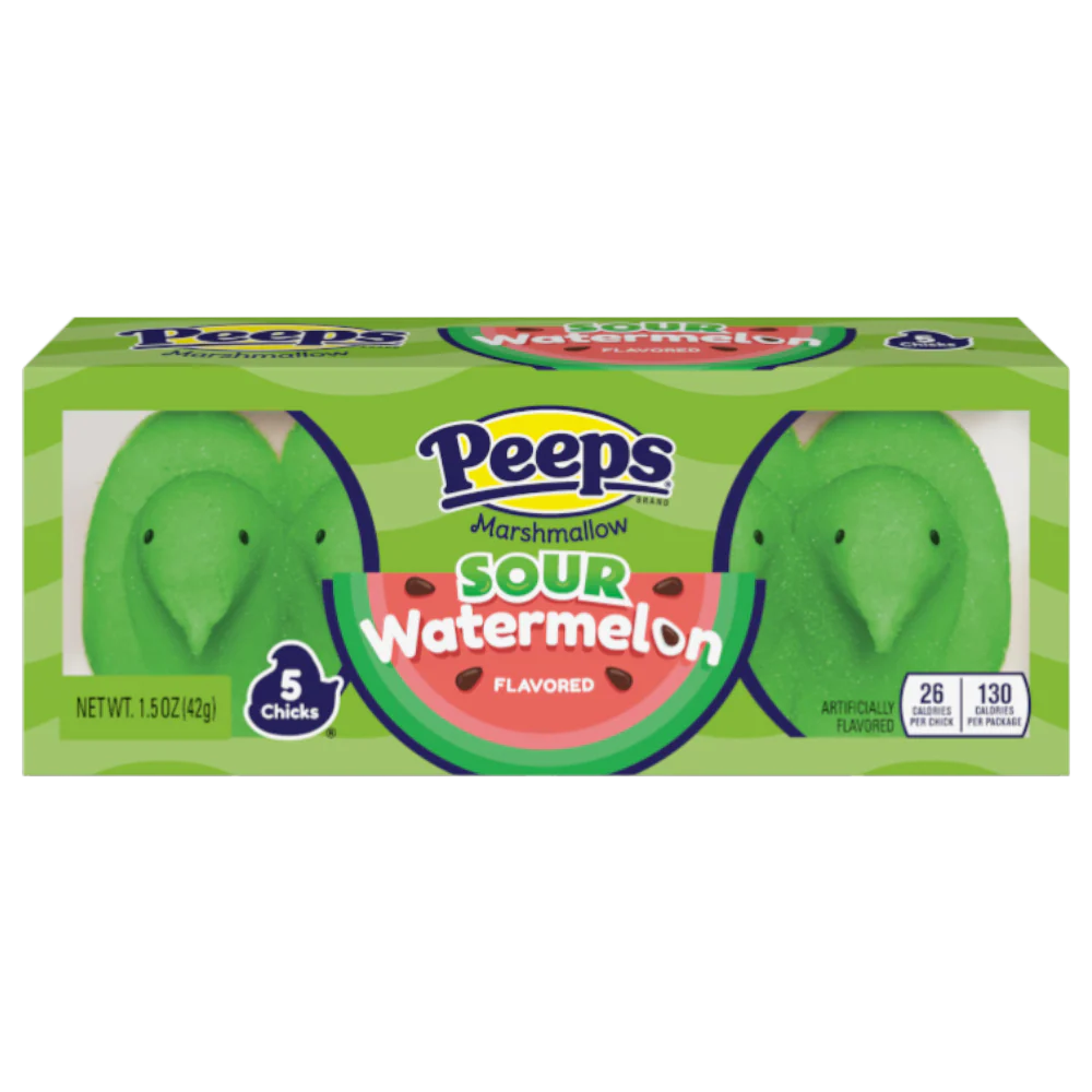 Peeps 5ct Sour Watermelon 42g is a small American pack of five marshmallow chicks coated in a tangy sour watermelon sugar. Each chick is soft and pillowy with a sharp watermelon flavour and a gentle sour kick from the sugar coating. The 42g pack is a sensible single-serve or small share size for Easter baskets, lolly buffets, and American candy care packages. Peeps is a well-known US brand with a long tradition of novelty marshmallow treats, now in a sour flavour that appeals to teen and adult lolly fans. Ships from SweetsWorld in Australia.