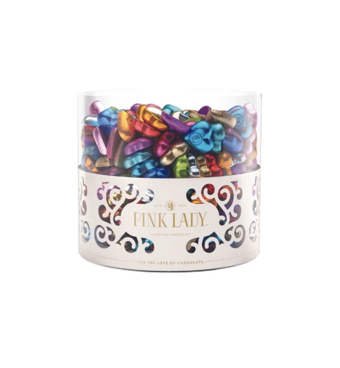 Pink Lady milk choc hearts are small heart-shaped chocolates in mixed foil colours, sold in a 2kg bulk bag. Each 8g heart is made with smooth Pink Lady milk chocolate and wrapped in a bright foil, with the mixed colour assortment creating a cheerful look when poured into bowls. The 2kg size suits weddings, engagement parties, Valentine displays, wholesale candy buffets, and large event favour tables where heart-shaped chocolates are needed in volume. Pair with other Pink Lady chocolate shapes for a full celebration range. Ships from SweetsWorld in Australia.