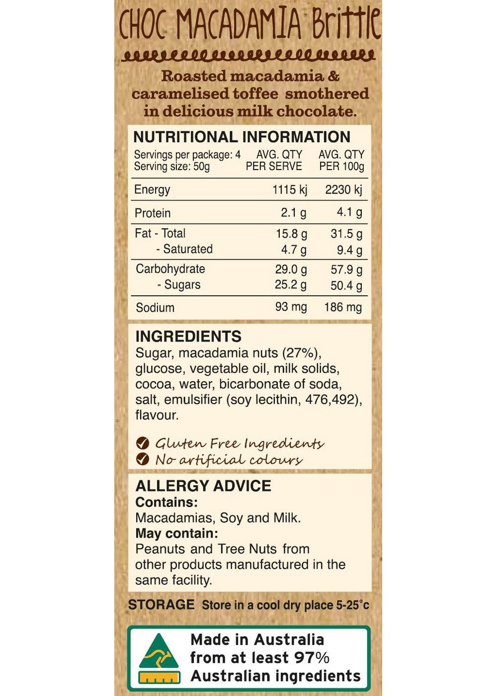 INGREDIENTS: Sugar, macadamia nuts (27%), glucose, vegetable oil, milk solids, cocoa, water, bicarbonate of soda, salt, emulsifier (soy lecithin, 476,492),