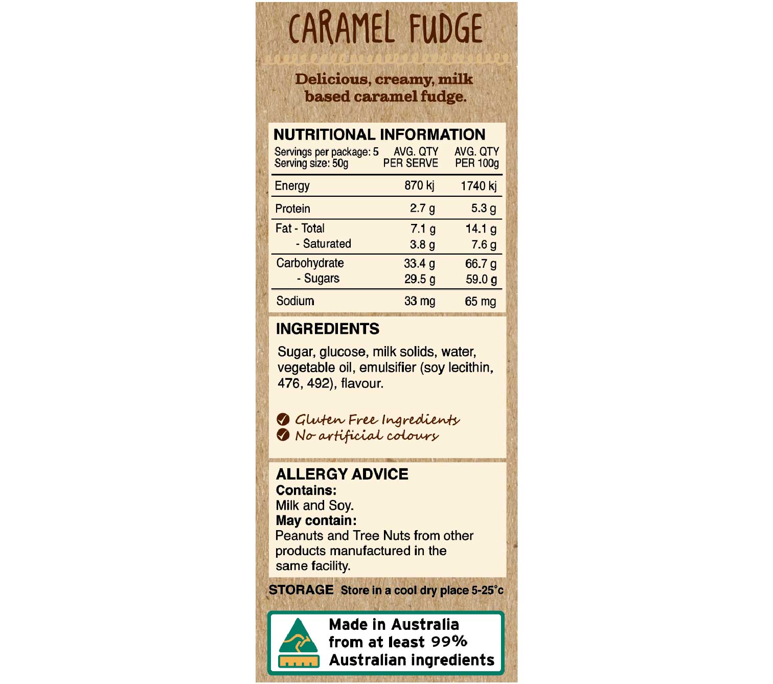 Our famous Caramel Fudge is as authentic as fudge gets! We boil and stir quality Australian ingredients in a big copper pot then pour out the creamy caramel mixture onto a tray, once cooled we roller cut into the delightful bite sized cubes you know and love! We recommend buying double as you won’t want to share!